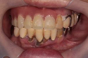 下の前歯は歯石が継続的に付着しているため、歯肉も支える骨(歯槽骨)も退縮し、歯の根が露出してきています。