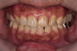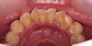20代の方の初診時ですが、歯並びのガタガタ(叢生)の部位にだんだんとたまった歯石がみられます。
